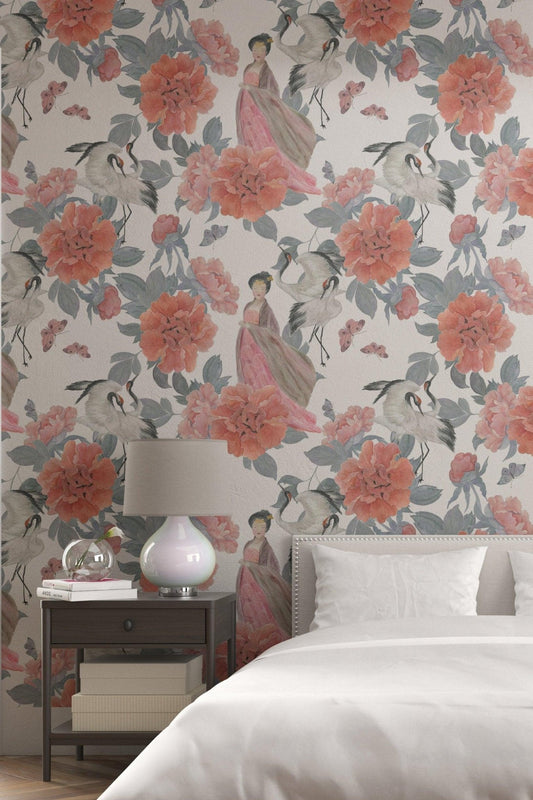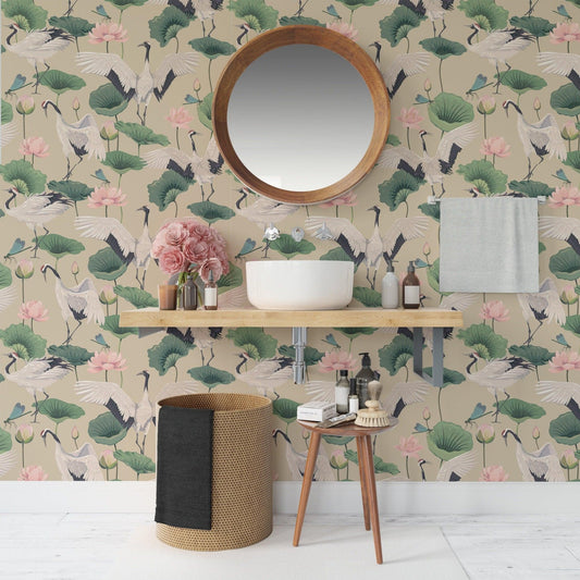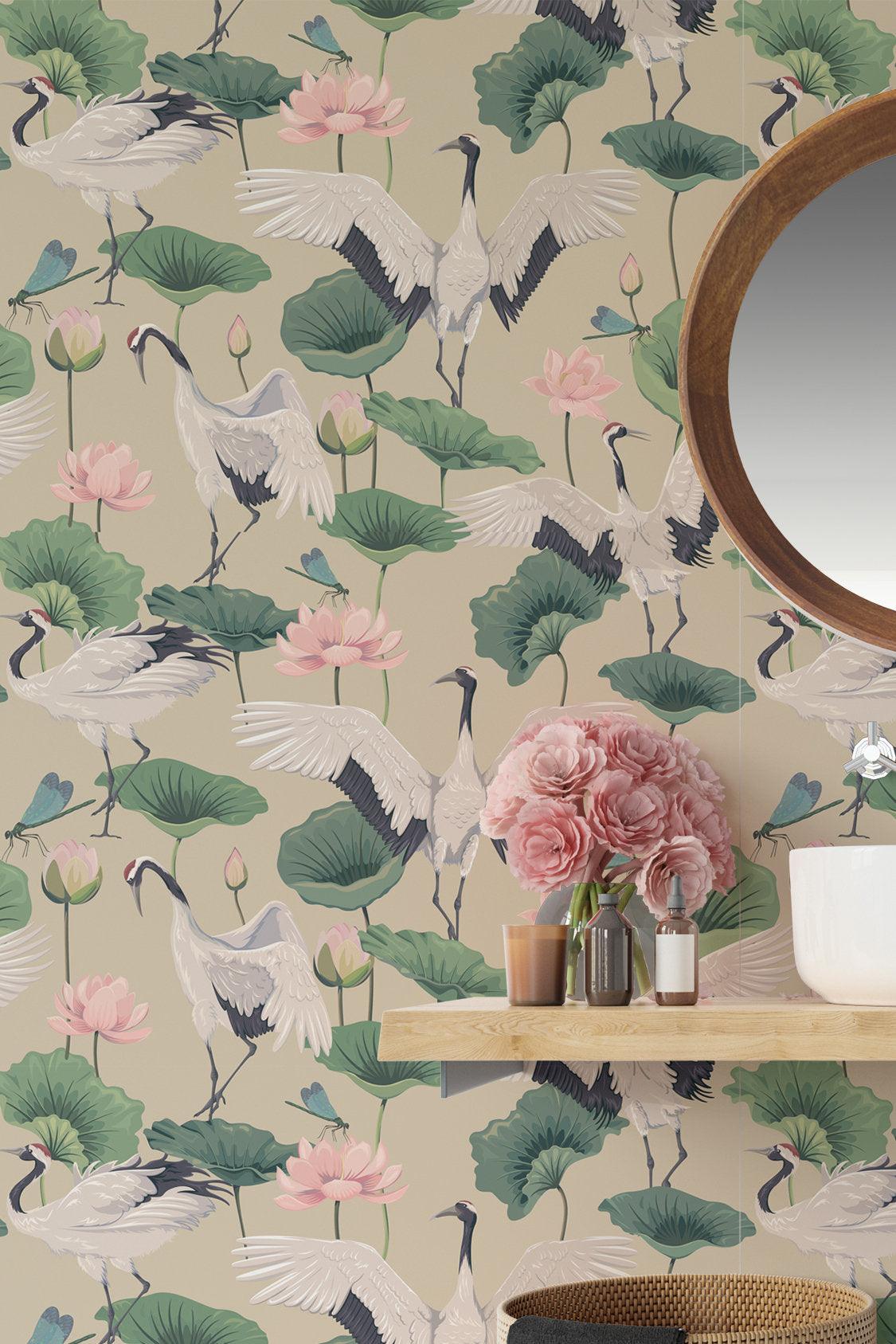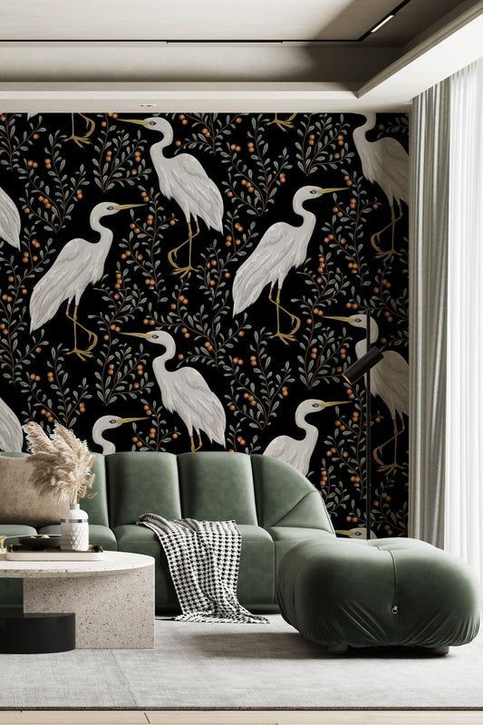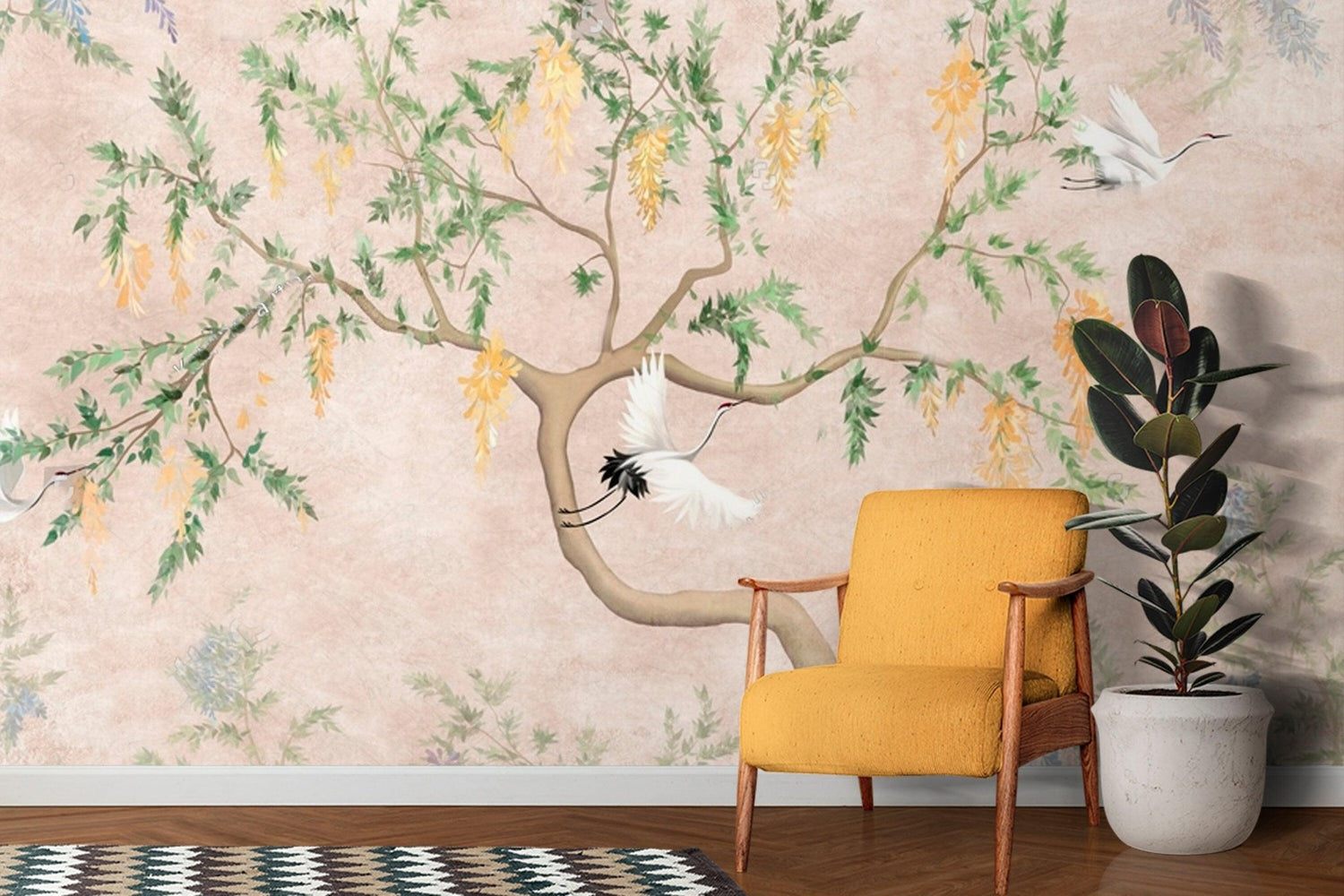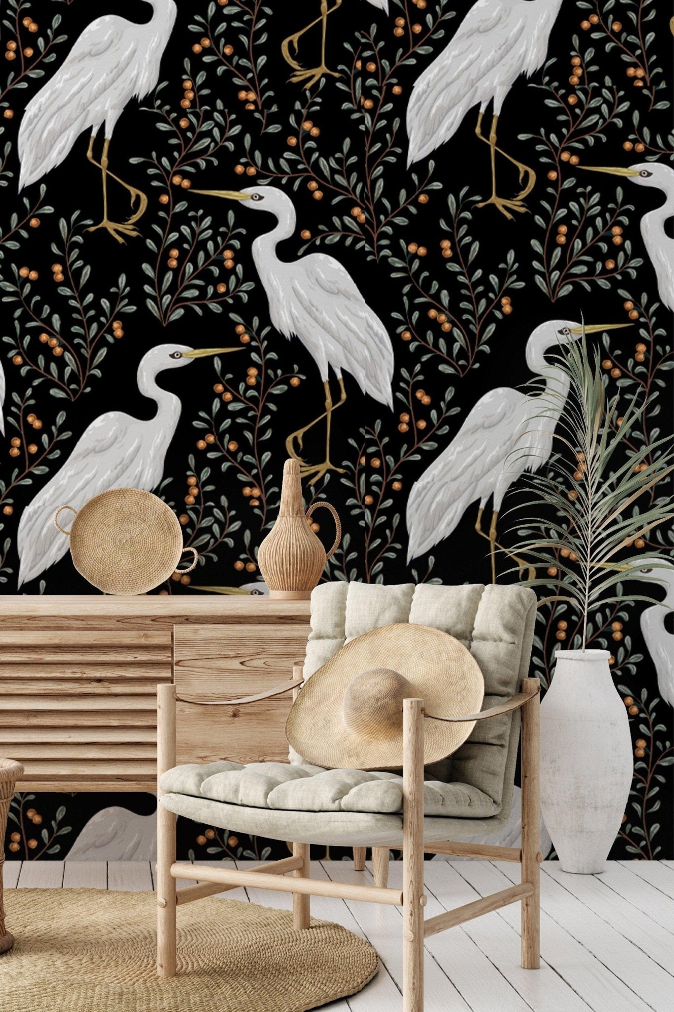 Heron wallpaper chinoiserie vintage cranes wall mural peel and stick wallpaper art decor