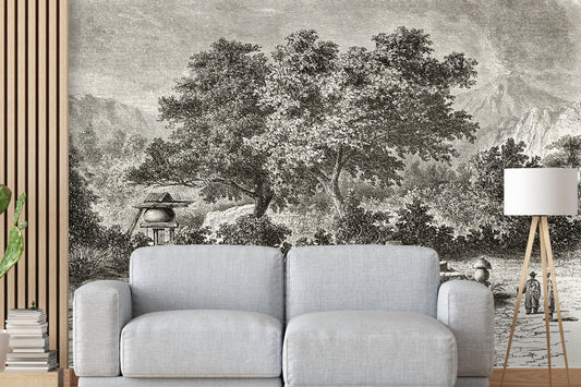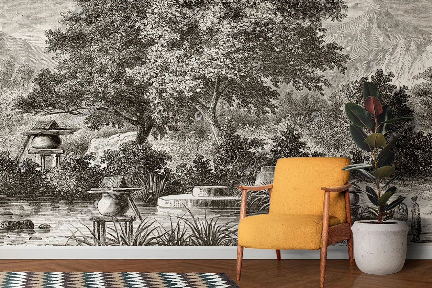 Japanese Garden Wallpaper Peel and Stick Vintage Wall Mural Monochrome Wallpaper
