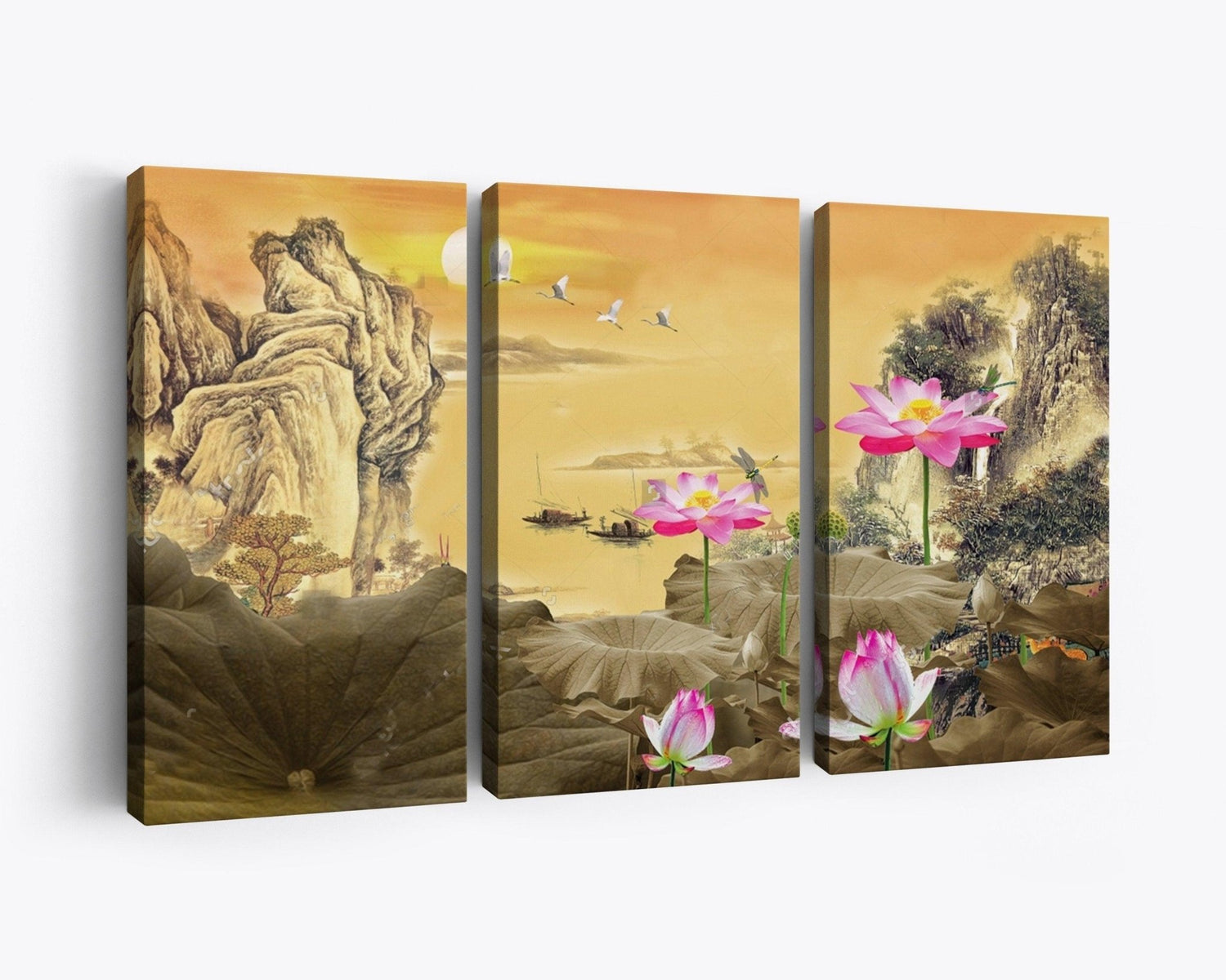 Japanese Print Mountain and Lotus Wall Art Japanese Botanical Art Lotus flower Large Canvas print