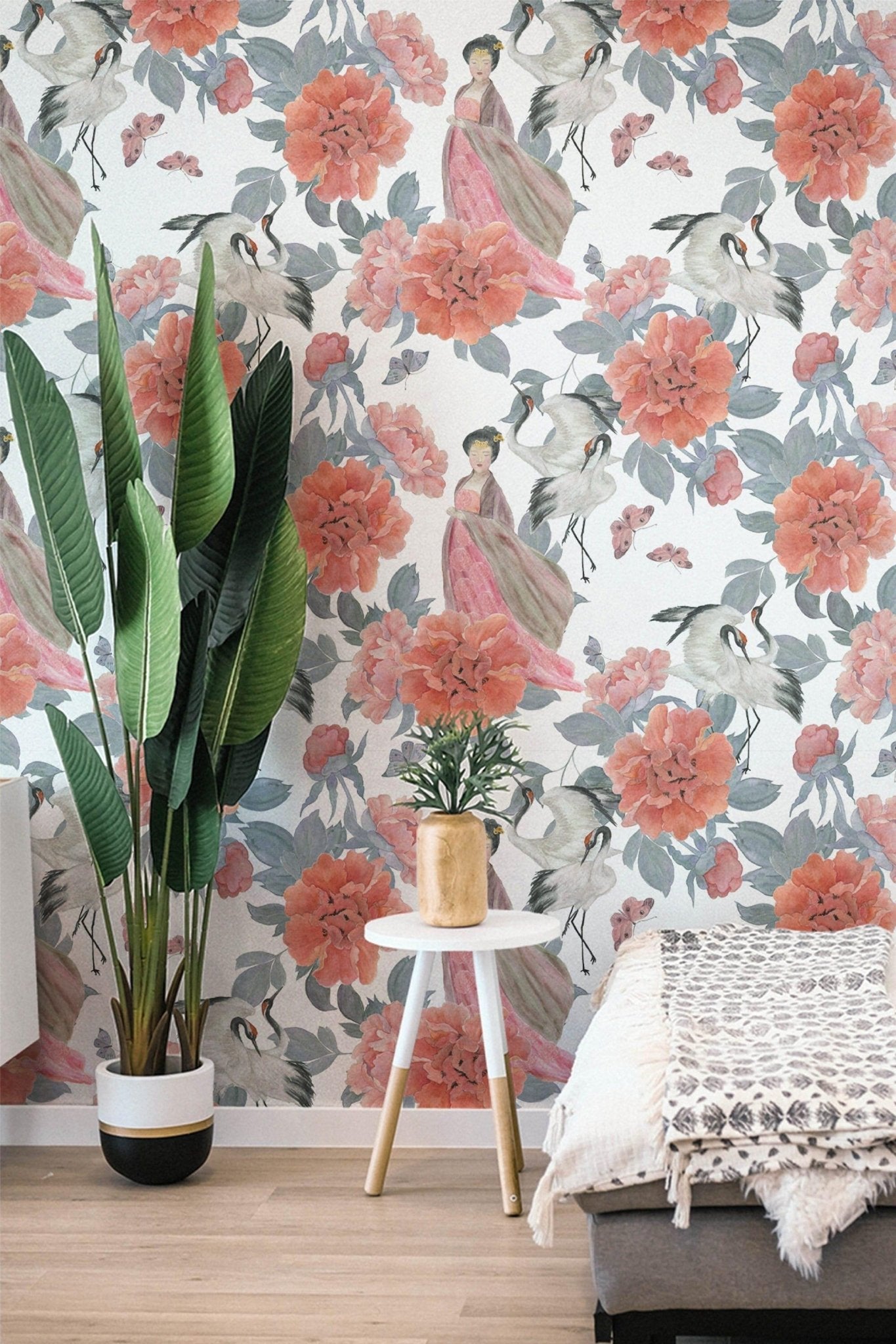 removable wallpaper chinoiserie mural peony and heron peel and stick wallpaper