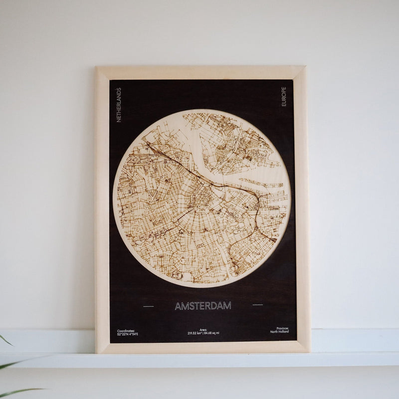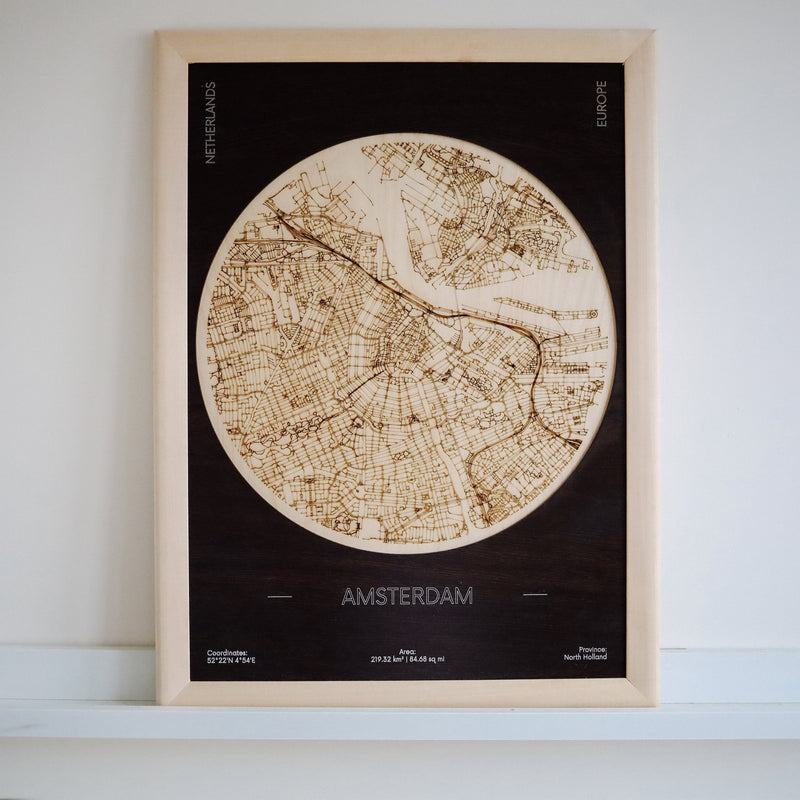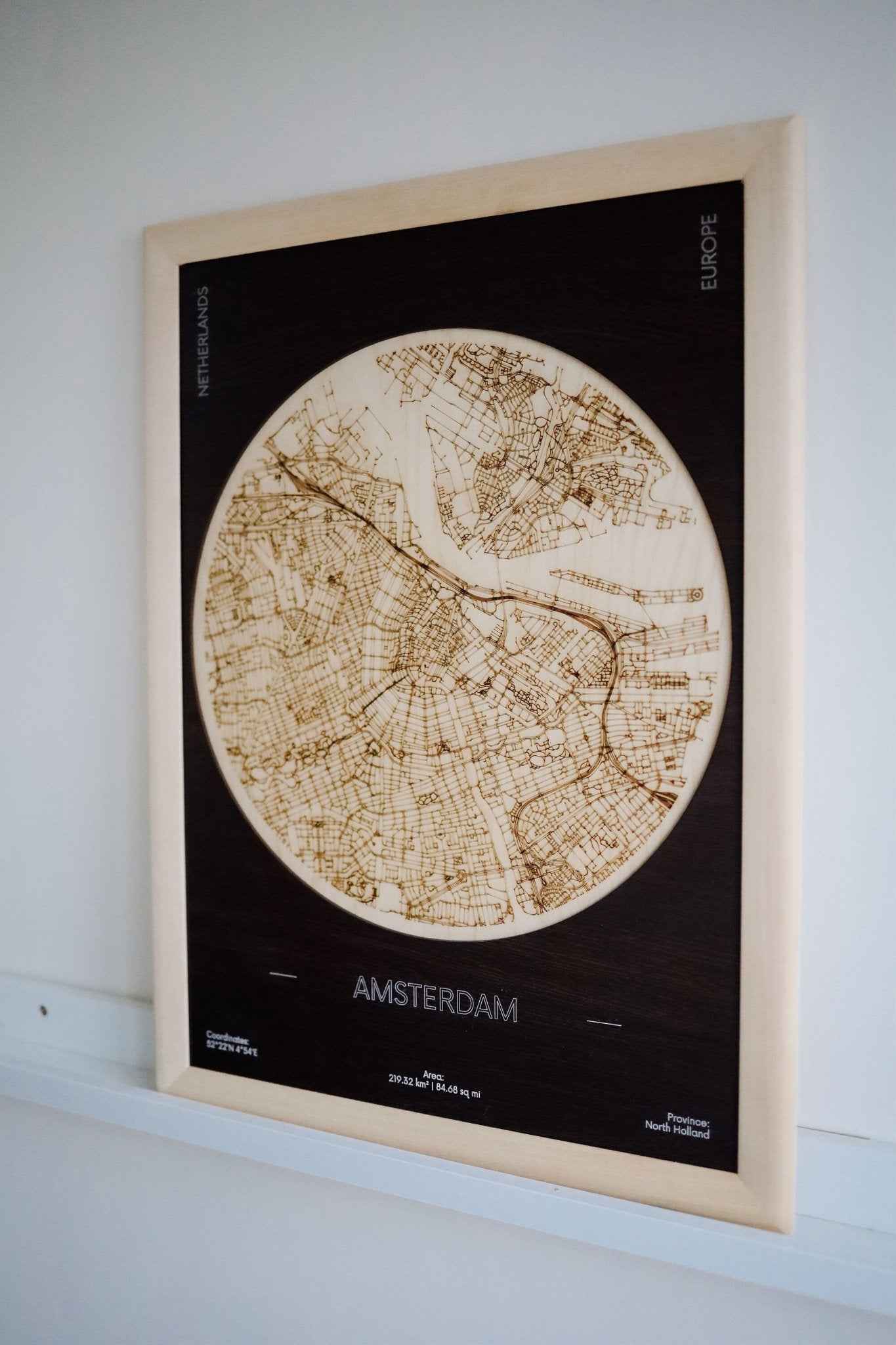 Amsterdam city map, Custom Wood Map, Framed Wooden Map Laser cut