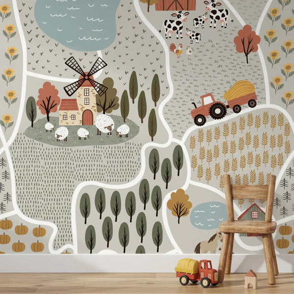 Create an imaginative farmhouse nursery with countryside charm. Our farm map wallpaper features adorable windmill, barn, animals, tractor, fields, trees, and pond on beige - perfect for playful, educational, and farmhouse nurseries.