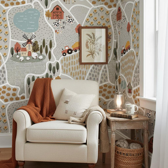 Farm Map Wallpaper Kids Room | Countryside Nursery Decor | Tractor Barn Animals | Peel and Stick or Traditional