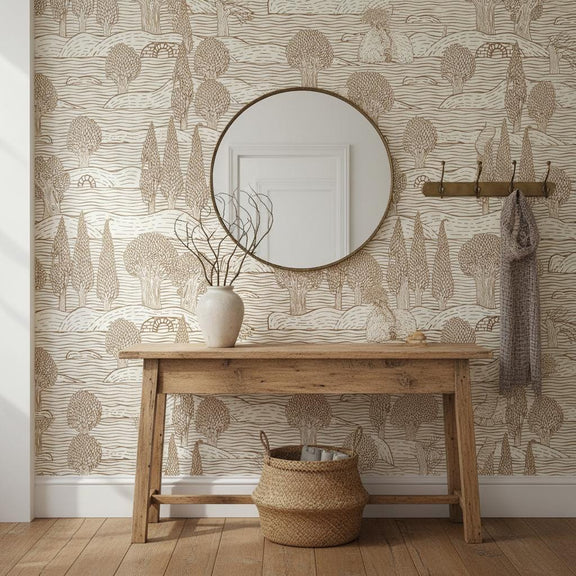 Bring the countryside indoors with our artistic landscape wallpaper. Premium removable peel-and-stick design in brown & cream with hand-drawn trees and rolling hills.