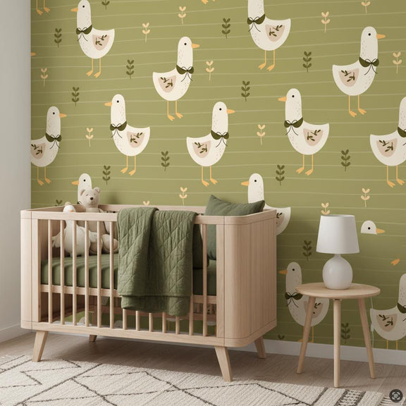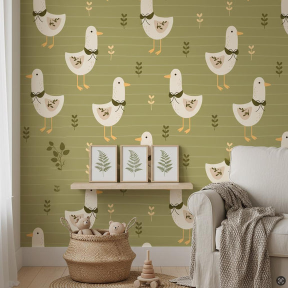 Modern Goose Wallpaper Olive Green | Scandinavian Farmhouse Nursery | Botanical Kids Room Decor | Peel and Stick